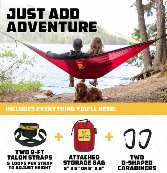 Wanda zai iya shiga tsakani 3-in-1 Yana da kayan aiki tare da 2, 9-ft Talon madauri, 2 o-dimbin carabines, da jakar ajiya mai haɗe. Kamar yadda yake da sauki a kafa, hammidock namu ne mai mahimmanci.